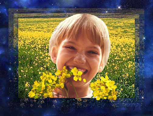 This art piece is based on a photo I took of my daughter as a child, long before I had ever heard of biology experiments in space. She's in a field of mustard flowers, which are closely related to the species that made history on the Space Shuttle. When I learned about that experiment out in space, it occurred to me that Humanity is now in a transitional period of crumbling philosophical structures and beliefs which served as guidelines for us in the past. We are all like those seedlings growing in microgravity. We're all becoming Children of Light, as we learn to follow the light within ourselves, instead of external guidelines.