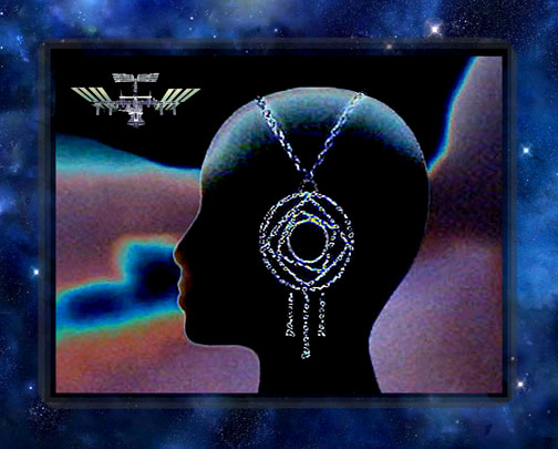 | The feminine figure represents our long submerged feminine faculties like intuition, and the bright object in the sky is the International Space Station. The ISS represents our expansion beyond the earth-bound restraints of gravity, and this is paralleled by our inner expansion beyond the linear restraints of the intellect. These are complementary aspects of the present quantum leap in our evolutionary development. |